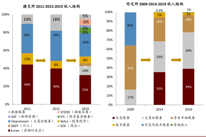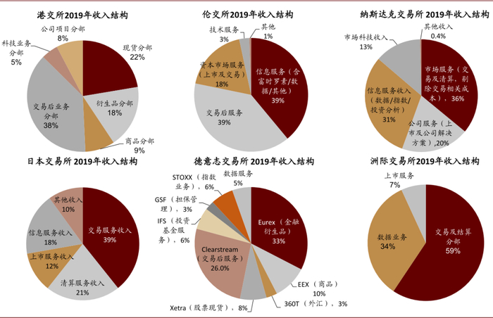 德交所业务架构完善,衍生品、交易后业务及技术能力突出。1)完善、覆盖交易前&中&后流程的业务架构。德交所目前已形成涵盖交易、清算、结算、托管、数据和技术服务的一体化全流程业务架构,交易产品涵盖现货、衍生品、商品、外汇、结构化产品、债券、数字货币等,并拥有企业风险投资平台和金融科技平台为初创企业提供融资服务;2)衍生品和交易后业务能力突出。据WFE数据,2019年德交所个股期货和股指期货交易量均位列全球第3位;业务收入结构来看,衍生品交易和交易后业务是德交所最主要的收入来源、2019年收入占比分别为46%和35%;3)突出的技术能力。早在1991年,德交所就推出了现货市场综合交易信息系统IBIS、开始建立交易系统技术壁垒;1997年,全电子化系统Xetra取代了IBIS,并成为日后欧洲最先进、最重要的现货交易系统之一;2013年,Eurex完成向先进的集团T7交易系统的迁移。此外,德交所清算公司与Eurex都采用Xetra交易系统,实现了交易与清算的系统统一、有利于降低系统风险。
