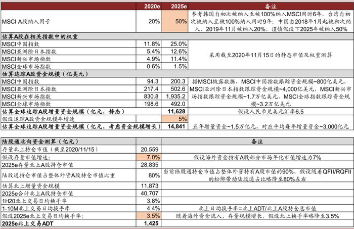图表: 假设MSCI A股纳入因子由当前的20%提至2025年的50%、追踪A股资金规模年增速5%、存量市值增速7%、北上交易日均换手率3.5%,则2025e北上交易ADT为1,425亿元