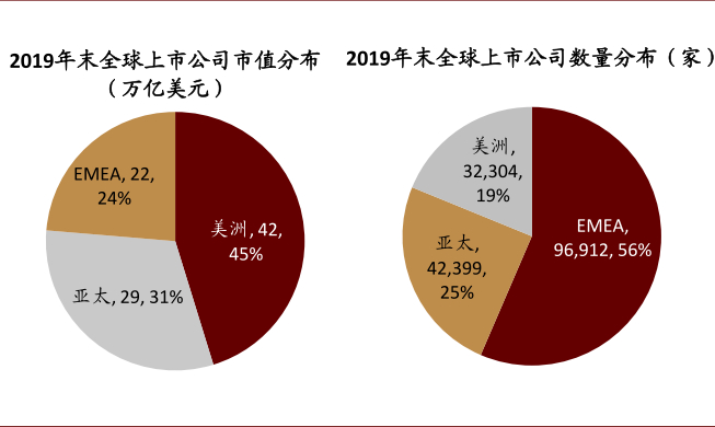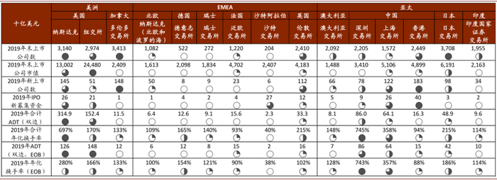 从全球交易所规模体量来看,美洲地区规模最大、EMEA地区数量最多、亚太地区增长快速。观察主要交易所分布情况:1)美洲地区交易所上市公司市值规模最大,且平均单家上市公司市值最高。据WFE统计,截至2019年末,全球上市公司总市值达93万亿美元,其中美洲、亚太、EMEA地区分别占比45%、31%、24%,美洲地区平均单家上市公司市值13亿美元(VS. EMEA 6.8亿美元、亚太2.3亿美元);2)EMEA地区交易所数量最多。截至2019年末,WFE统计在册的交易所会员单位及分支机构合计85家,EMEA地区共48家交易所(vs.美洲16家、亚太21家);3)亚太地区交易所上市公司市值过去十年复合增速达10%、从2015年起规模已超过EMEA。