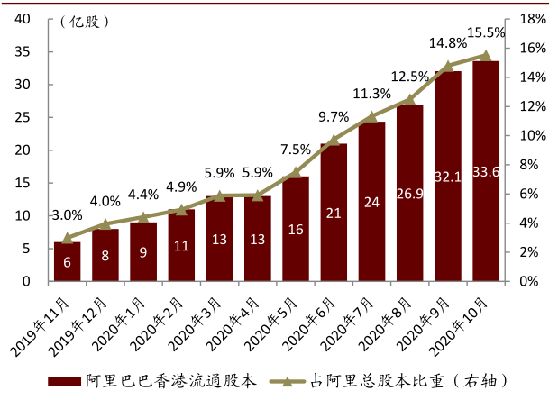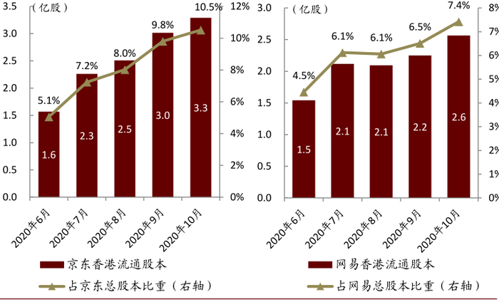 图表: 阿里/京东/网易二次上市以来、港股可交易股份占比持续转换提升