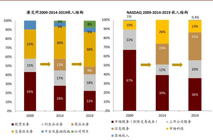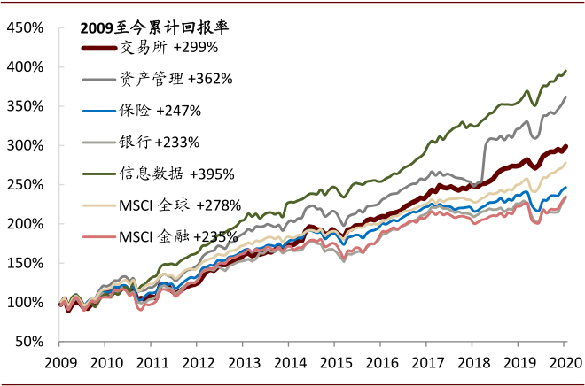 ► 收入结构优化:收入更加多元化、传统交易占比逐步降低、业绩稳健性加强。其中,港交所的现货业务收入占比由2009年的43%降至2019年22%,纳斯达克的交易收入由2009年的67%降至2019年36%、同时信息及科技收入之和由10%提升至44%,德交所在2011年Eurex (金融衍生品)、Xetra(股票现货)、Clearstream (交易后服务)及数据等业务上,新增商品、外汇、投资基金、担保管理、指数等多元收入。