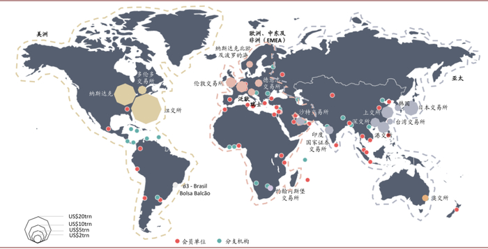 全球交易所格局:美洲/EMEA/亚太三分天下,美洲规模最大、EMEA[1]数量最多、亚太快速增长