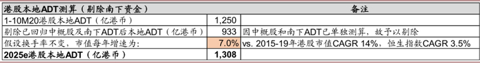 ► 5)港股本地ADT测算:剔除中概股和南下ADT影响,假设港股本地存量市值每年增速7.0%、换手率不变,则2025e港股本地ADT将达1,308亿港币。
