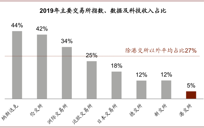 图表: 港交所数据及科技收入占比显著低于国际主要交易所平均水平