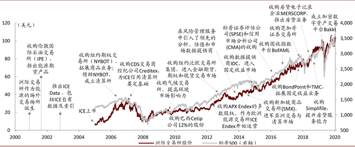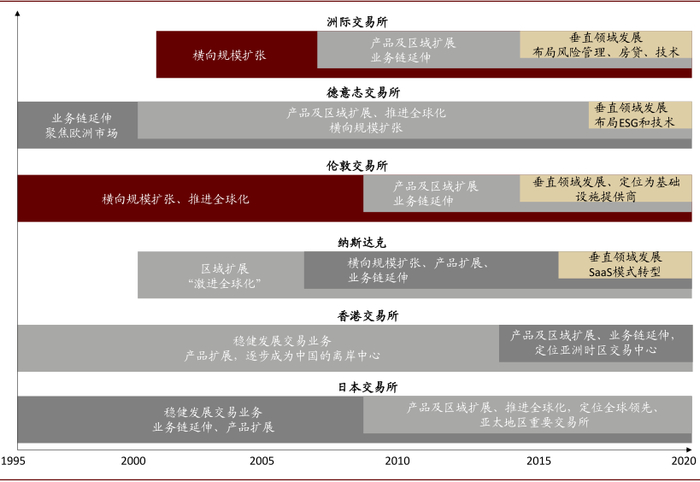 洲际交易所通过外延式并购发展成综合型交易所:1)横向规模扩张:2001年以来,洲际交易所收购了伦敦国际石油交易所、Endex交易所、纽约期权交易所等,扩展商品交易能力和范围,并将布伦特原油等核心能源指数收入囊中;2)横向品类拓展:2007年,洲际交易所收购Creditex、进入CDS市场;2013年,收购纽约泛欧交易所集团(同时将纽约泛欧交易所集团的欧洲交易所和泛欧交易所伦敦分拆为独立实体Euronext N.V.)、进入金融衍生品和现货交易市场;2015年以后,陆续收购了IDC、BondPoint、BofAML等,拓展固定收益业务;3)业务链延伸:2007年以来,陆续收购了纽约期货交易所清算公司、新加坡商品交易所清算公司等,拓展交易后业务;4)垂直领域收购:2015年至今,公司在风险管理、数据分析、房贷业务等领域收购和引入了数据提供商和技术公司,并成立了加密数字资产交易平台Bakkt。