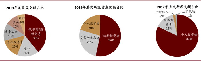 ► 投资者结构:上交所个人投资者成交额占比显著高于港交所和美股,而港交所个人投资者成交额占比略高于美股。