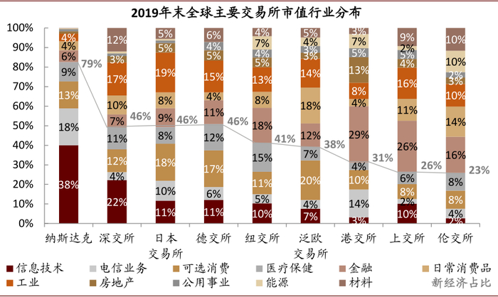 ► 上市公司结构:截止2019年底,纳斯达克、深交所和日本交易所新经济[2]相关行业占比更高,分别为79%、46%、46%;伦交所及上交所占比较低、分别为26%、23%。其中,港交所自2018年实施上市制度改革以来,新经济行业占比提升明显,由2018年的30%提升至2020年11月的40%。