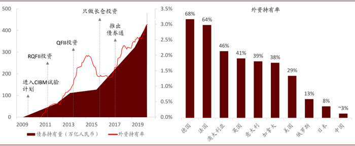图表: 债券通推动外资持有境内债券比例提升、且相较于国际市场仍有显著提升空间