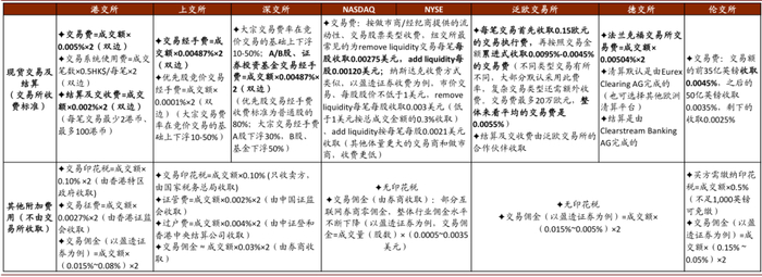图表: 同一时区交易所的现货交易费规则较接近,整体来看美股交易费最低、欧洲与A/H收费相近