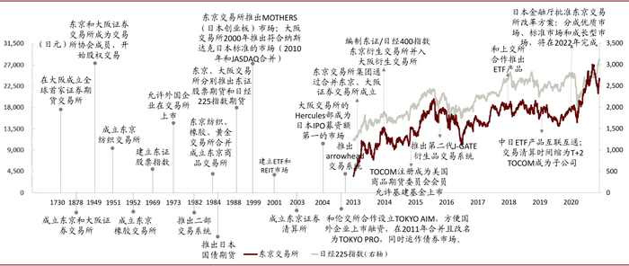 日本交易所发展历程可分为两个阶段:1)2008年以前,稳健发展交易业务、丰富业务架构,逐步成为上市公司市值全球领先的交易所。经过多年发展,东京和大阪交易所的产品逐步涵盖现货交易、指数产品、商品交易、金融衍生品交易,于2003年成立东京证券清算所、完善交易后市场,并逐步构建起包含主板、高增长板块、场外市场的多层次资本市场。据WFE数据,截至2008年末,东京证券交易所的上市公司市值达3.1万亿美元、排名全球第二;2)2008年至今,形成日本交易所集团、推进全球化战略。2013年,东京和大阪交易所合并为日本交易所集团,并通过与伦交所合作设立TOKYO AIM、协助仰光交易所运作、与伦交所战略合作、开通中日ETF产品互联互通等。