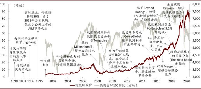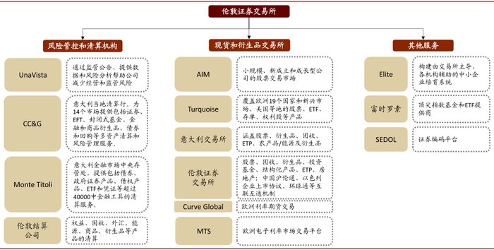 1698年,伦敦证券交易所的前身伦敦交易街露天市场成立,1773年伦交所正式成立,并于2001年上市。目前,集团旗下拥有现货及衍生品交易所、清算结算公司及富时罗素指数公司等,可交易资产涵盖股票、ETF、存单、权利股(Rights issue)、投资基金、固定收益产品、ETP、房地产投资产品、指数等,并提供风险管理、中小企业培育等其他服务。