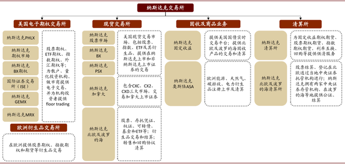 1971年,纳斯达克作为全美证券交易商协会的自动报价系统诞生。1998年,纳斯达克与美国证券交易所合并,并于2000年改制成为自主经营、盈利性公司。2002年,纳斯达克完成上市。目前集团旗下包含期权及其他期货期权交易所、现货交易所、固收交易平台、商品交易所以及清算所,可交易资产涵盖各类金融期权期货、指数产品、股票、ETF、存托凭证、可转债、债券、能源等商品,并提供企业服务及解决方案、数据分析、SaaS业务等。