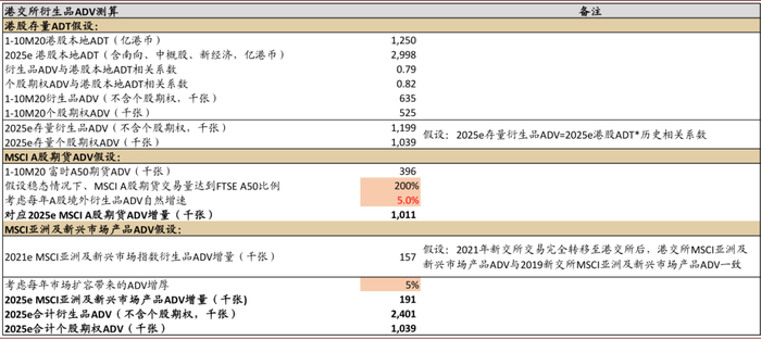 ► 2)MSCI A股期货产品增量ADV测算:以同为境外A股衍生品的新加坡富时A50期货为参考,1-10M20其ADV为39.6万张。考虑MSCI A股指数的对冲效果较富时A50更好(因其指数覆盖成分股较多)、且港交所的投资者基础较新交所更好,假设稳态情况下、MSCI A股期货交易量达到富时A50的200%,每年A股境外衍生品ADV自然增速为5%,则2025e MSCI A股期货增量ADV为101.1万张。