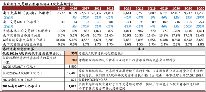 图表: 假设A股机构投资者成交额占比35%、其中投资港股的占比20%,则2025e南向ADT为1,029亿港币
