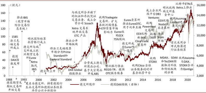 德意志交易所的发展历程大致可分为三个阶段:1)2000年以前,德交所主要聚焦欧洲市场、布局一体化业务链,1992年以来陆续收购了德国证券结算存管公司、明讯国际结算托管银行等。2)2000-2017年,德交所推进业务、产品多元化和全球化。集团收购了欧洲期货交易所(Eurex)、欧洲能源交易所(EEX)、指数公司STOXX、外汇交易平台360T等,拓展业务及产品类别;通过合作或自设推出了场外回购、电力现货交易、“个人结算”、ETC产品、基于大宗商品的ABS等产品;此外,德交所收购了美国国际证券交易所、新加坡Cleartrade交易所等,并与巴西、中国、印度、非洲等市场建立了合作关系。3)2017年以来,德交所积极布局ESG和前沿技术,推出了交易所交易ESG期权、STOXX ESG Select衍生品和DAX50 ESG指数等,并积极探索区块链和数字货币的应用——2020年已在Xetra上推出了全球首个集中清算的比特币ETN。