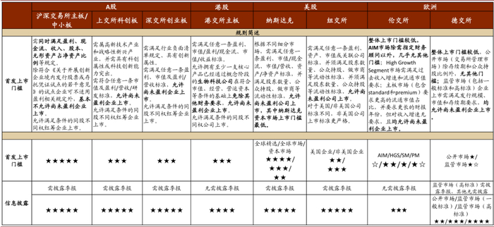 2)上市门槛方面,沪深交易所上市门槛要求最严,主板要求上市公司需同时满足盈利、现金流、收入、股本等多项指标,基本不允许尚未盈利企业上市;港交所、纳斯达克和纽交所的上市门槛整体适中(纳斯达克和纽交所因不同市场而有所不同),要求企业满足市值/盈利/现金流等任一测试即可上市,允许尚未盈利企业上市;欧洲交易所上市门槛较低,部分市场对盈利和收入均无限制。