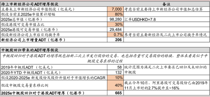 图表: 预计2025e中概股回归及新经济上市分别带来665亿港币和206亿港币的ADT增厚