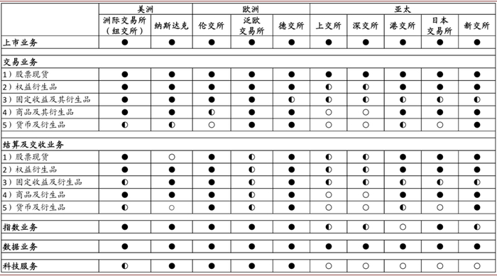资料来源:公司公告,公司官网,中金公司研究部;注:1)●指有且功能丰富、完整;◐指有限功能及服务,或合资建立、不具备控股权;○指没有或业务非常少;2)上交所和深交所权益衍生品交易及结算业务均为◐,主因中国结算和中证指数是由上交所和深交所分别持股50%