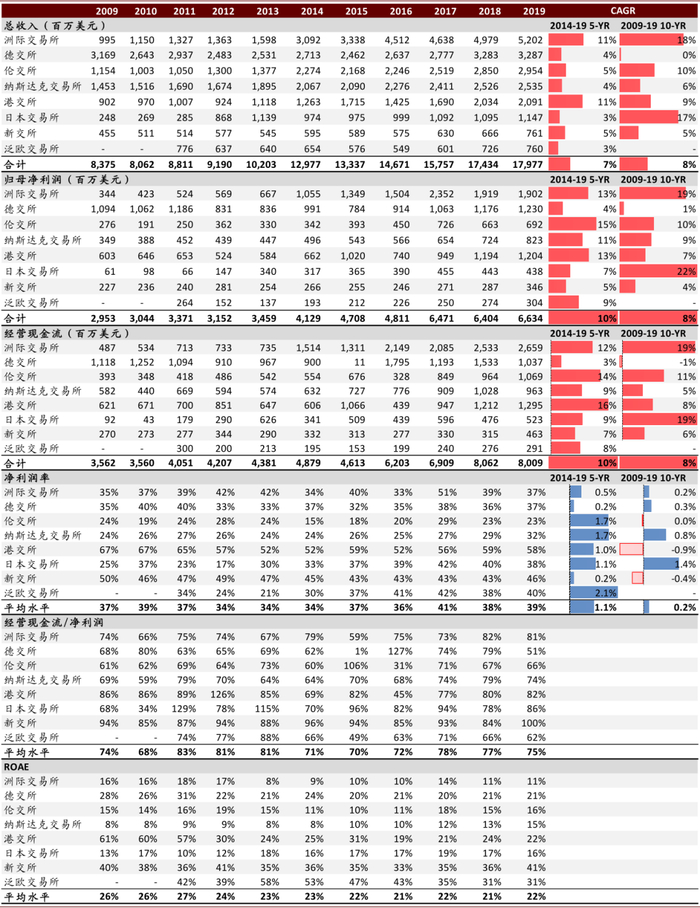 ► 经营现金流及股东回报优厚:轻资产、平台化运营模式,使得交易所现金流状况优异,为持续的战略收购以及优越的股东回报提供支撑。2014-2019年主要七大国际交易所经营现金流复合增速均达10%,其中港交所高达16%、伦交所达14%次之;过去五年平均经营现金流占EBITDA比例均超过70%。股东回报方面,过去十年主要交易所平均ROAE均保持在20%以上水平,其中新交所最高、2019年达41%,泛欧交易所、港交所、德交所均高于20%。