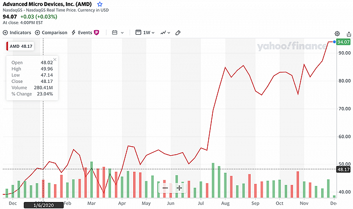 2020年接近尾声,这一年间,芯片巨头AMD的股价几乎翻番,市值越过千亿美元大关,新品屡获消费者叫好,在芯片圈烜赫一时。
