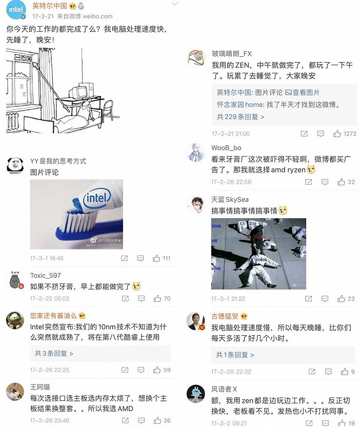 Ryzen发布当天,中国网友们纷纷跑去调戏英特尔中国官方微博。