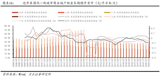商业地产租金维持低速增长。在消费结构不断升级与城市化进程加快的背景下,我国居民文化娱乐消费需求不断增加,过去5年来我国一线城市商业地产租金均呈现出稳中有升的态势。随着疫后经济逐步复苏、内需潜力不断释放,未来高品质商业地产也将恢复平稳运行、稳步低速增长趋势。我们选取1%-8%年化增速假设进行敏感性测算。
