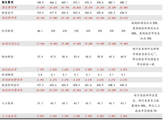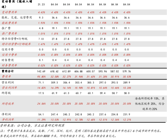 假设2:三亚、海口、北京及上海仍旧贡献国内收入的主要来源,免税店开业仍然受到严格审批限制,门店坪效未被分散,随着规模的扩张,规模优势逐步被强化。