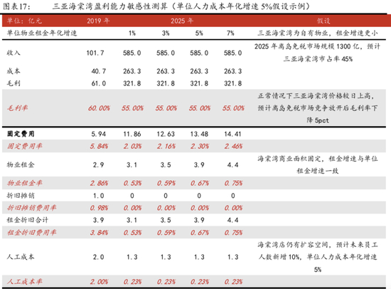 若满足上述假设,三亚海棠湾未来盈利能力有望提升2.6-3.2pct。①其他假设条件:由于三亚海棠湾为中免自有物业,合理推测未来租金增速稍缓于境内整体水平;参考我们的深度报告《中国中免:扶摇而上,免税王者再续峥嵘》中的测算,2025年离岛免税市场规模约1300亿元,估计海棠湾在海南市占率约45%;考虑到2019年香港价格较三亚高6%,韩国较三亚低约15%,受海南离岛免税市场开放的影响,假设未来海棠湾单店毛利率下降至55%左右。海棠湾店仍有免税商业面积扩容及品牌、品类引入的空间,保守估计未来员工人数增加10%。②测算结果:在租金年化增速1%-7%,单位人力成本增速5%-11%假设下,2025年海棠湾盈利能力约在33.38%-34.40%,较2019年的31.24%提升约2.6-3.2pct,以2025年收入规模585亿元测算,约带来15.3-18.5亿增量利润规模。