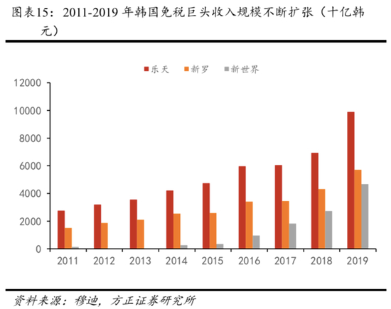 1)韩国返佣折扣高企。为吸引国外代购,韩国免税商通常给予平台会员10%-20%折扣,在这基础上给予旅行社20%返佣,综合返佣折扣率在35%左右。在高返佣的吸引下,国外代购贡献了韩国约60%以上的免税收入,形成了与中国境内依靠本国消费截然不同的免税生态。2019年新罗市内店给予代购约42.39%的高额返佣扣点(以新罗未经折扣的总收入为基数计算,2019年新罗整体返佣率约33.6%。据海鸥免税店APP,机场返佣率约20%,倒推测算得市内店返佣率约42.39%)。