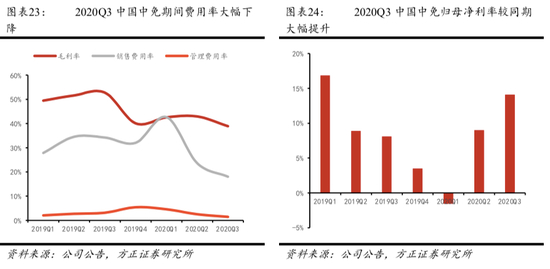 2020年三季度,规模效应提振盈利能力初现成效。由于产品结构改变,2020Q3中国中免毛利率为38.89%,环比下降4pct。在新政催化下,2020年三季度离岛免税销售规模大幅提升至86.1亿元,同比上升227.5%。收入规模的迅速扩张使得费用端进一步摊薄,Q3销售费用率18.03%/-16.18pct,管理费用率1.46%/-1.70pct,中免整体归母净利率提高至14.1%,大幅高于去年同期的8.1%,环比Q2提升5.1pct。中国中免在毛利率有所下降的情况下依然实现了归母净利率的大幅提升,这一规模效应的背后体现了收入端扩张远高于费用端增长,对盈利能力的提振效果已经显现。