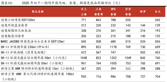 促销情况下(2020年双十一期间),各免税商打折力度空前,大致可体现出各免税商的降价意愿和降价能力。海外免税商受疫情影响更大,其降价力度和意愿较国内免税商更大。2020年6月份以来韩国免税商加大促销力度,折扣最低达三折,这一举措推动中国赴韩代购自6月份起大幅恢复。双十一期间国内免税商(尤其是离岛免税业务)同样积极参与全国性的购物狂欢节,双十一当天离岛免税购物额超3亿。在海内外免税商同时降价的情况下,国内离岛免税价格与全球最低水平韩国的差距进一步缩小。韩免价格仅低于三亚海棠湾4-12%,香港莎莎价格较三亚低约7%,香港DFS价格较三亚高约30%。