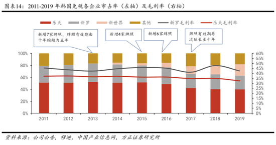 韩国免税复盘:规模优势支撑下,牌照放开后龙头免税商毛利率依然保持稳定。韩国政府自2013-2016年间持续放松免税政策,陆续增加17张免税牌照,韩国免税市场迎来重大调整。新罗与乐天两大原有免税龙头合计市占率有所下降但幅度有限,自2014年的81.31%逐步下降至2019年的62.82%,在这一过程中乐天与新罗的收入绝对规模持续增长。得益于收入的不断扩张,规模优势支撑下两大龙头在牌照放开前后毛利率变化并不明显。