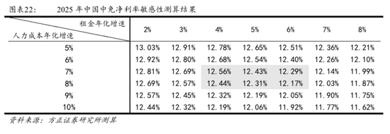 若满足上述假设,中国中免未来整体盈利能力有望提升0.3-1.7pct。①其他假设条件:参考我们的深度报告《中国中免:扶摇而上,免税王者再续峥嵘》和《免税行业深度系列一:万亿消费回流催生免税千亿空间》中的测算,2025年中国内地免税市场规模约3000亿元,其中离岛免税约1300亿,海南外免税市场约1700亿。保守假设2025年中免在离岛免税市场中市占率为65%,其中市内店占比80%,机场店占比20%,机场扣点率约20%;海南外市内店市场占比约60%,其中中免市占率50%,扣点率约10%;海南外机场店占比约40%,其中中免市占率80%,扣点率约40%。在毛利率方面,由于境内市场整体竞争放开,中免毛利率略微下降。参考内地国际客流量排名前十城市,有6个城市中免仍未开店。以新增武汉市内店为例(单店面积8000平米,坪均年租金1万元),未来单个城市市内店需要年租金约0.8亿。考虑中免5年内在全国的开店计划,预计未来新增员工数量约50%。②测算结果:在租金年化增速2%-8%,单位人力成本年化增速5%-11%假设下,2025年中国中免净利率约在11.62%-13.03%,较2019年的11.29%提升约0.3-1.7pct,以2025年收入规模1899亿元测算,约带来6.3-33.1亿增量利润规模。