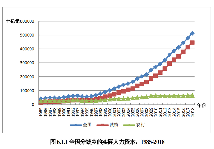 1985-2018年间,中国劳动力人力资本总量增长10.4倍,年均增长率是7.5%。近十年(2009-2018年)的年均增长率为8.4%,其中城镇人力资本总量的年均增长率为10.6%,而农村为3.0%。