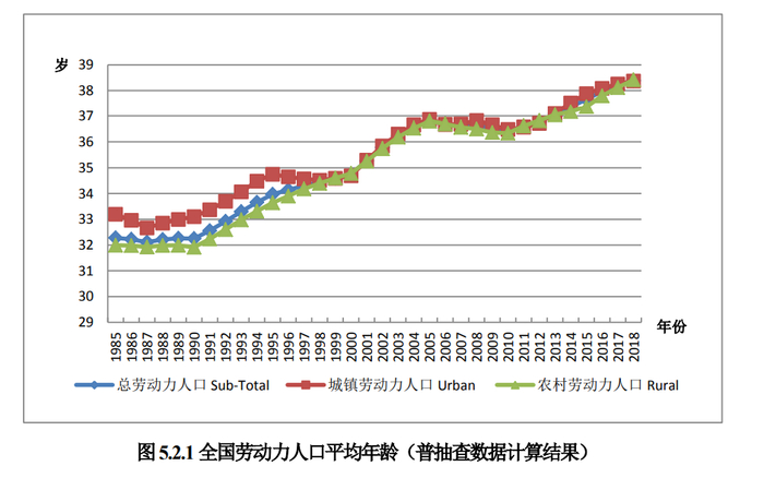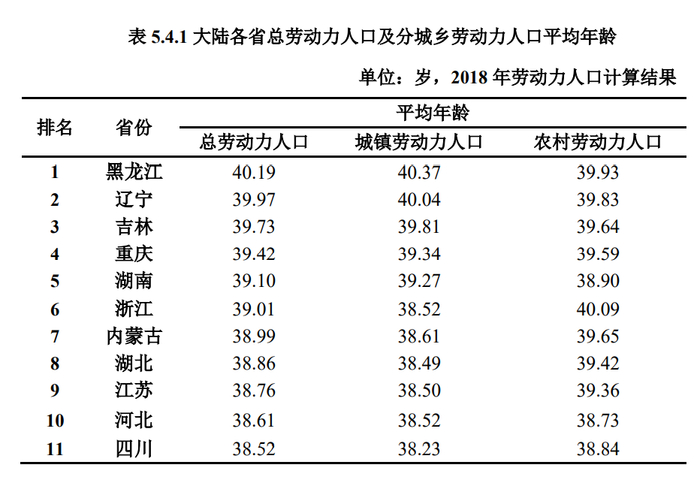 数据显示,全国农村劳动力的平均年龄从1985年的31.85岁上升到了2018年的38.42岁,城镇劳动力的平均年龄从1985年的33.44岁上升到了2018年的38.37岁。平均年龄最高的前五个省份是黑龙江、辽宁、吉林、重庆、湖南。