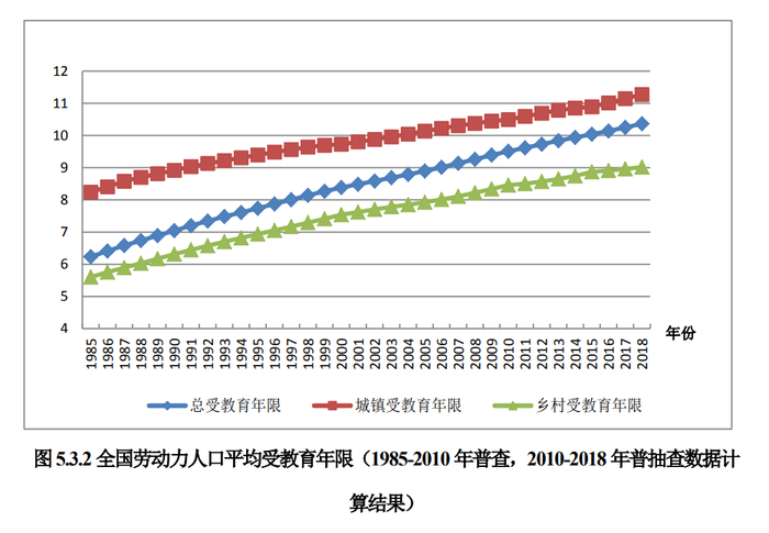 数据显示,我国的平均受教育年限整体呈上升趋势,全国从1985年的6.24年上升到了2018年的10.36年,农村从1985年的5.60年上升到了2018年的9.02年,城镇从1985年的8.24年上升到了2018年的11.27年。