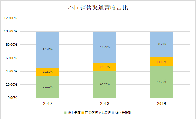 根据招股书数据,在渠道结构上,蓝月亮2017-2019年线上渠道贡献的营收占比逐步提升,2019年线上营收占比总营收的47.1%。