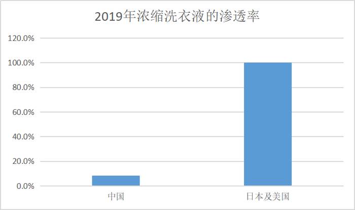 另一方面,洗衣液浓缩化已经成为发达国家的主流消费趋势。根据弗若斯特沙利文的报告,美国、日本2019年的浓缩洗衣液渗透率达到了100%,与之相比,中国2019年的浓缩洗衣液渗透率仅为8.2%。