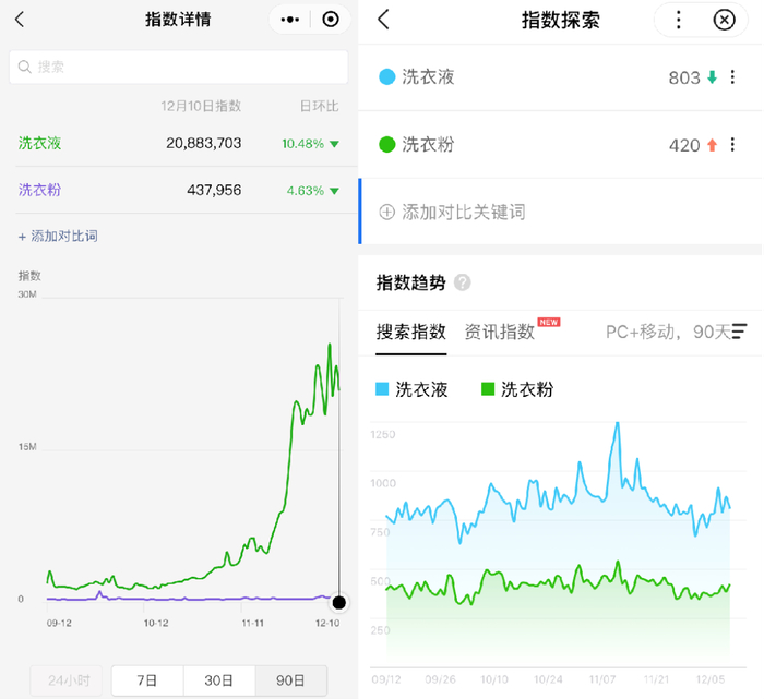 根据最近的微信指数(下图左),洗衣液的热度指数(90天内)以及环比增速,都远高于洗衣粉;百度指数也是同样的趋势,洗衣液的搜索指数远高于洗衣粉。