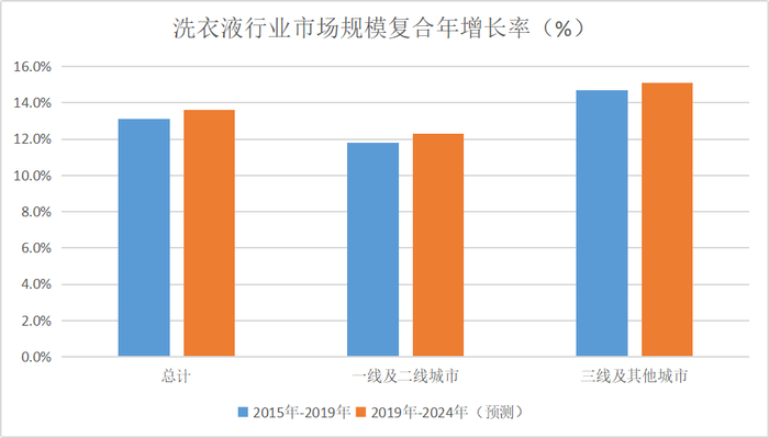 除了区域性分化,分级市场也表现出同样的趋势。对比2015年~2019年洗衣液在分级市场的年复合销售增速,属于下沉市场的三四线城市明显高于一二线城市。