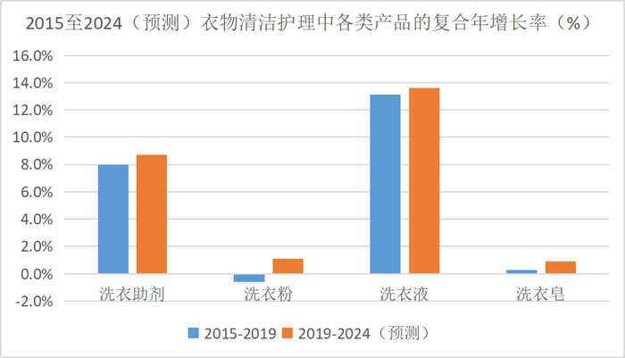 数据显示,目前洗衣液逐渐代替洗衣粉,成为衣物清洁洗护市场的消费主流。如下图所示,2015年~2019年,在众多的衣物清洁品类中,洗衣液以超过13%的年复合增长率,持续高速增长;洗衣粉的年复合增速则为负值。