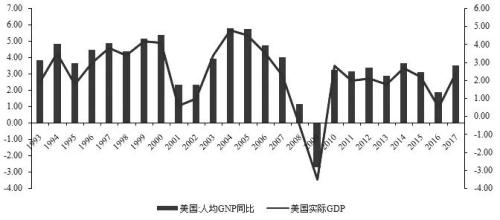 图为美国人均GNP和美国实际GDP增速走势