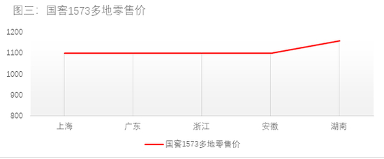 国窖1573也在多地出现零售端和批价同步涨价。上海地区该品种批价涨幅为5%,零售价最高为1099/瓶,最高涨幅也在5%左右;湖南地区批价上涨50元左右,售价最高达1159元/瓶;广东、浙江、安徽等地区零售价基本维持在1000元左右。