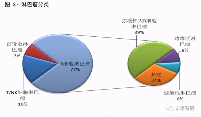 淋巴瘤,根据瘤细胞分为霍奇金淋巴瘤(HL)和非霍奇金淋巴瘤(NHL),其中 NHL 占 80%—90%, 根据细胞来源可分为 B 细胞类型、T 细胞类型和 NK/T 细胞类型。其中,70%-80%%都是 B 细胞系,少数为 T 细胞系,NK 细胞更少见。B 细胞淋巴瘤中,弥漫性大 B 细胞淋巴瘤占到 30%-40%。弥漫性大 B 细胞淋 巴瘤(DLBCL)是 NHL 中最常见的类型。