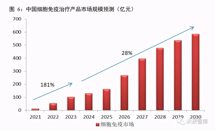 以 CAR-T 疗法为代表的免疫疗法取得突破性进展,为癌症患者带来新的希望,特别是集采及医保目录 谈判等新机制的出台,显著提升患者的支付意愿及能力,细胞免疫将逐步解决目前临床上未满足的重大需求,与此同时国内细胞免疫行业也迎来重大的市场机遇。根据 Frost & Sullivan 报告,中国细胞免疫治疗产 品市场规模预计于 2021 年至 2023 年由人民币 13 亿元升至 102 亿元,年复合增长率为 181.5%。预计市场于 2030 年达到人民币 584 亿元。