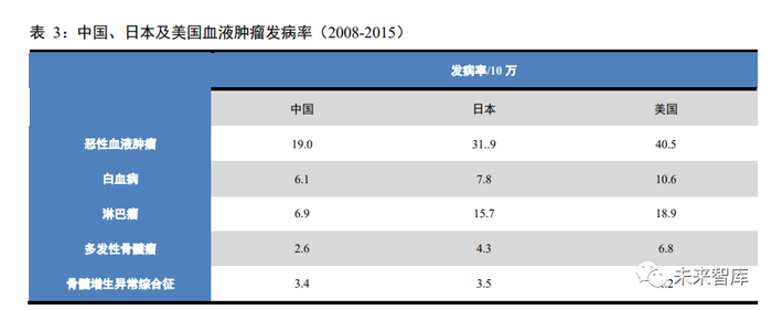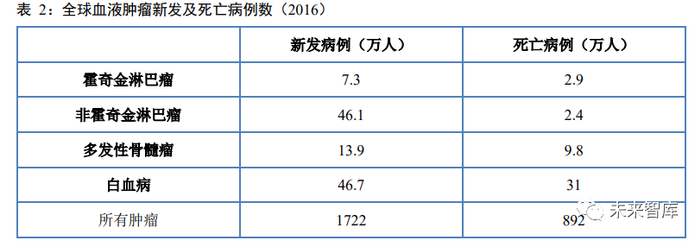血液系统肿瘤是一种包括淋巴瘤、白血病及多发性骨髓瘤等在内的造血系统疾病,具有恶性程度高、 治疗复杂及预后较差等特征。与实体肿瘤不同,血液肿瘤主要采用放化疗联合骨髓移植进行治疗,随着靶 向治疗及免疫治疗给临床带来新的选择,患者的生存期也得到显著提高。根据 2016 年一项对全球疾病负担 研究的报告,全球每年血液肿瘤新发病例数与死亡病例数分别为 114 万和 46 万,分别占到所有肿瘤的 7% 和 5%。