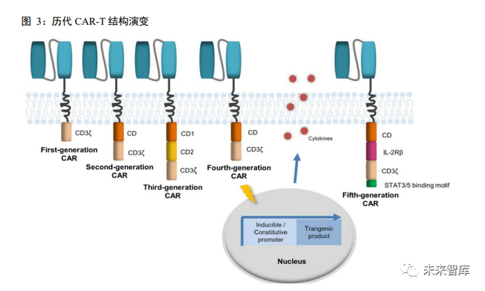 CAR-T 疗法至今一发展到第五代:第一代 CAR 仅依赖于 CD3ζ介导 T 细胞激活,由于缺乏胞内共刺 激信号,并不能提供长时间的 T 细胞扩增信号和持续的抗肿瘤效应,临床疗效有限;为了提高 T 细胞的增 殖活性延长其存活时间,通过在胞内信号转导区增加一个或两个共刺激分子(CD28、4-1BB、ICOS 或 OX40 等),由此产生了第二代和第三代 CAR,在现有的共刺激结构域中,CD28 和 4-1BB 是应用频率最高的共刺 激分子,相比之下 4-1BB 作为共刺激信号的 CAR-T 细胞在体内扩增更温和持久,发生细胞因子风暴风险较 低,复发率也更低;第四代 CAR 则是引入了促炎症细胞因子(IL-12、IL-15、IL-18 等)和共刺激配体,主 要目的是克服肿瘤免疫微环境的抑制,例如,CAR-T 细胞中一种经常过度表达的细胞因子是 IL-12,这是一 种增强 T 细胞分泌 IFNγ、颗粒酶 B 和穿孔素的有效分子,允许招募 NK 细胞消除 CAR 未能识别的肿瘤细 胞;第五代 CAR 则是在第二代的基础上,添加了激活其它信号通路的共刺激结构域,比如 IL2-2Rβ胞内结 合 SAAT3/5 的结构域等。目前大多数公司产品以二代 CAR-T 技术为基础,在此之上进行探索开发。