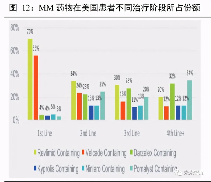 关于多发性骨髓瘤的药物市场,已形成了来那度胺、泊马度胺、达雷木单抗、硼替佐米、卡非佐米和 埃罗妥珠单抗等六大品种竞争的市场格局。以 BCMA CAR-T 为代表的免疫疗法的出现,以及 Belantamab mafodotin、XPO1 抑制剂、PD-1 等新的疗法出现,都将改变未来多发性骨髓瘤的药物格局。