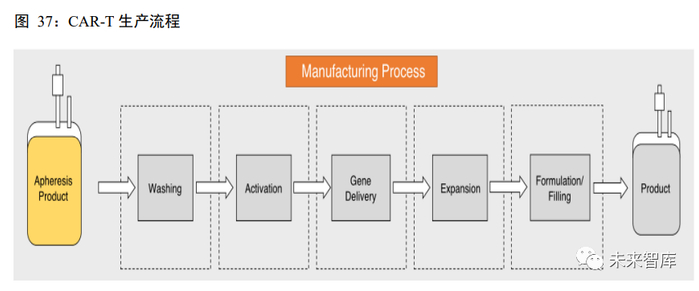 尽管 CAR-T 在临床上的安全性及有效性已得到验证,但由于其制造流程的复杂性、较长的生产周期及 缺乏标准化的监管,CAR-T 目前仍然是一种高度个性化的疗法。关于 CAR-T 生产流程,主要分为以下几步: