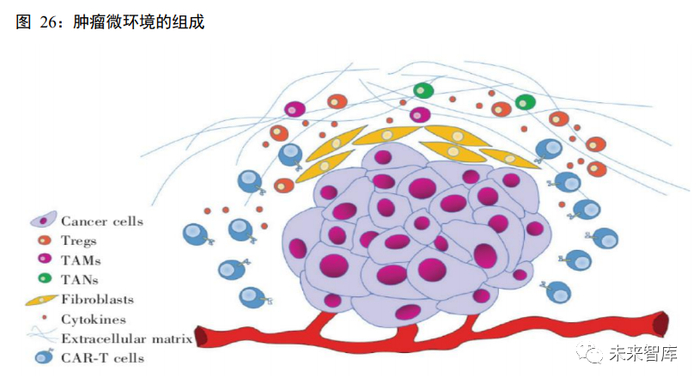 CAR-T 细胞难以有效浸润入肿瘤组织。与血液肿瘤不同,在将 CAR-T 回输患者体内后,CAR-T 细胞 想达到实体瘤部位需穿过细胞外基质并克服免疫抑制微环境等不利因素,而肿瘤的发生会使得细胞表面及 肿瘤微环境分泌的趋化因子不足,以及实体瘤本身的特征,如集中的血管、肿瘤相关的成纤维细胞及骨髓 细胞形成的细胞外基质等都增加了 T 细胞在肿瘤部位浸润的难度,这些都会导致 CAR-T 细胞不能有效浸润 肿瘤组织并杀伤肿瘤细胞。